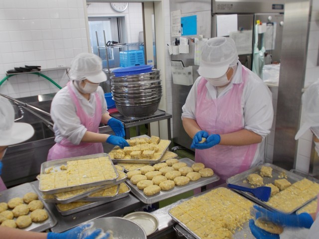 今日の給食は卵入りコロッケでした。コロッケの中の具材にゆで卵を細かくして混ぜたものです。コロッケを作るだけでも工程が多く手間がかかりますが、ゆで卵を作って、皮を一つ一つむいて、細かくして…とさらに手間のかかる料理なのですが、チームワーク良く作ってくれました。ボリュームのあるコロッケはとても好評でした。