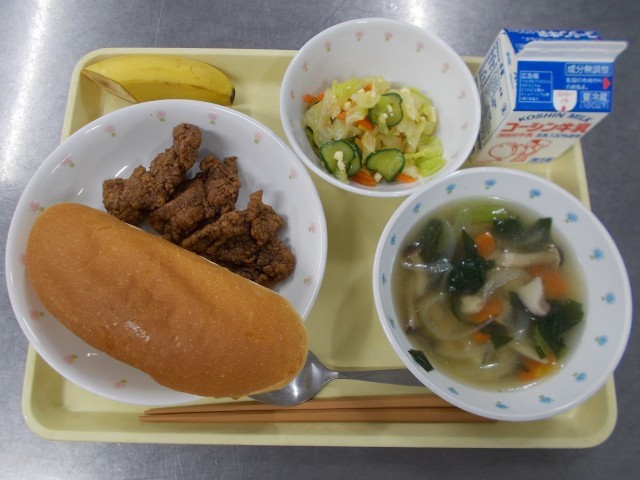 学校給食週間3日目です。昔の給食再現メニューです。戦後の給食は、パンが主食でした。また、栄養豊富なクジラ肉が良く食べられていたそうです。