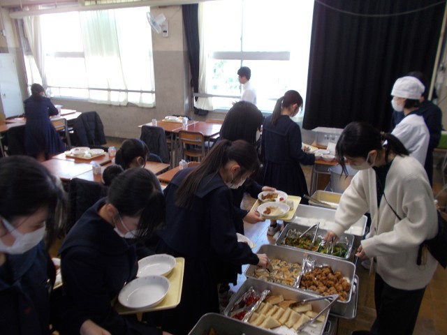 また、3年生は卒業をお祝いしたバイキング給食を全クラス一斉に行いました。品数がいつもの倍以上になっていて、料理がずらっと並ぶと3年生の生徒もとてもうれしそうにしていました。料理数が多いので、ひとつひとつの大きさや量は小さめにしていますが、いつもより全体量としては多くなっています。3年生、日々の給食でも完食を目指してクラスで協力してしっかり食べてくれているので、バイキング給食も全クラス料理は見事完食。すっからかんで食缶を返してくれました。