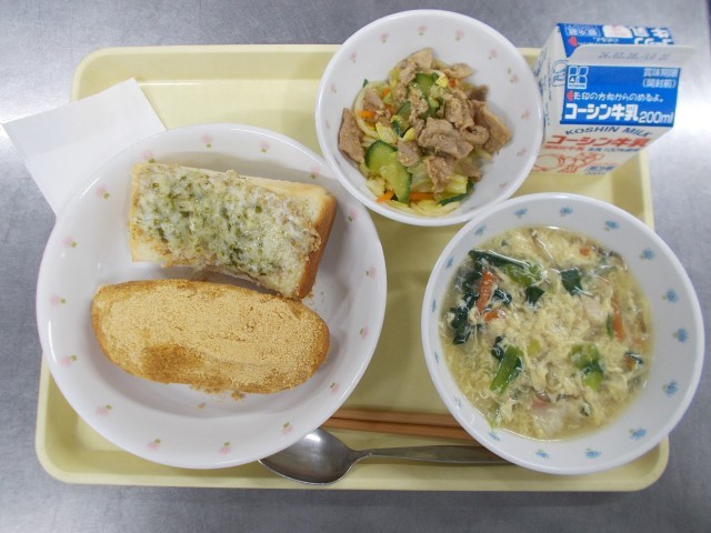 今日の給食は人気のきなこ揚げパンを小さめサイズにして、おかずパンのしらすチーズトーストを合わせました。しらすチーズトーストはしらすだけでなく、ニンニクやネギなど香味野菜、ごまなどをマヨネーズに混ぜ合わせて、チーズと青のりを合わせたものをかけてオーブンでこんがり焼き上げたものです。しらす・ごま・青のりなど栄養がギュッと詰まっている食材をたくさん使っているので栄養満点です。