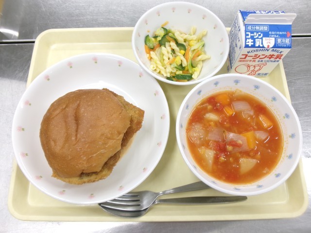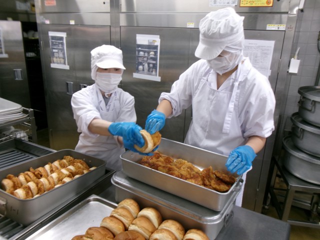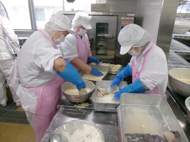 今日の給食の主食+主菜は『フィッシュバーガー』です。“ホキ”という白身魚に打ち粉をし、バッター液をつけ、パン粉をつけて、からりと揚げて白身魚のフライを作りました。その白身魚のフライにソースをかけてから、パンにキャベツと一緒に挟みました。バーガーにすることで、給食室での作業工程は増えますが、教室では配膳しやすく、どのクラスも素早く準備をすることができていました。