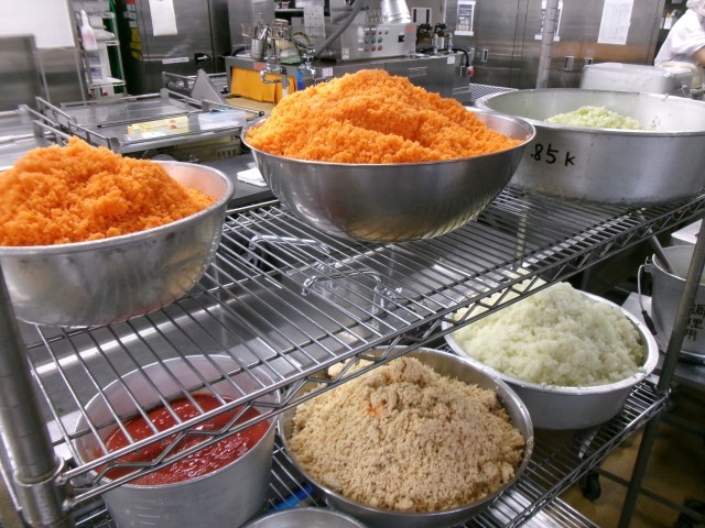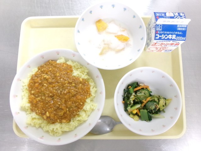 今日の給食の主食+主菜は『キーマカレー』です。豚ひき肉と大豆とたくさんのみじん切りにした野菜を使ったカレーです。大豆もみじん切りにしているので、大豆が入っていることに気付いていない人も多かったかと思います。ひき肉を使うことで、肉のうまみが出やすく、玉ねぎの半分は飴色になるまで炒めて入れています。野菜も細かくなっているので、たっぷりの野菜もぺろりと食べられます。今日も教室ではどのクラスも食缶がすっからかんになりました。