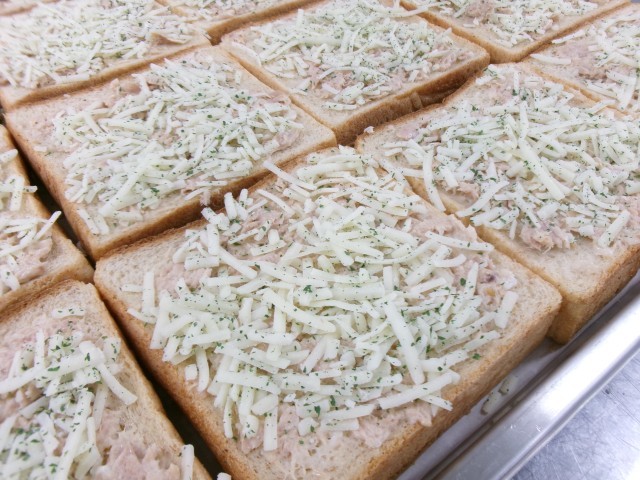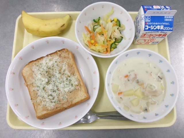 今日の給食の主食は『ツナマヨチーズトースト』です。パンは胚芽食パンを使用しました。胚芽食パンは通常の食パンに比べて、食物繊維や鉄、ビタミンB群など栄養価が高いです。
