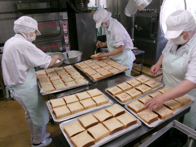 学校給食で使用しているパンは、学校給食用に決められた配合のパンを工場でつくってくれているため、余計な添加物が入っていない分、市販のパンより少し固めに出来ています。焼きたてはふわっとしていても、大量調理のため、焼いてから時間がたってしまうので、どうしても固くなってしまいやすいです。そのため、スチームをかけて焼いたり、時間や温度を調整したりと工夫をしています。また、耳の近くまでしっかりと具材を広げることで、耳までおいしく食べられるようにしています。