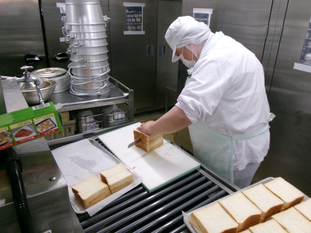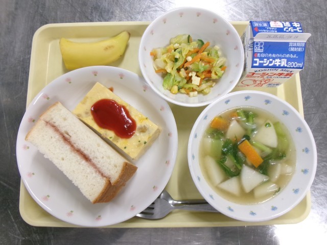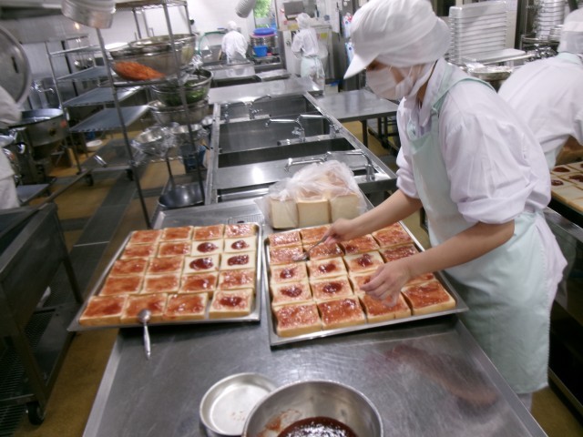 今日の主食は『いちごジャムサンド』でした。食パンにいちごジャムを塗って、サンドして、半分に切って、スチームコンベクションオーブンで蒸して仕上げました。蒸すことでパンはふわっともちっとして、焼いた時とはまた違った食感になりおいしいです。