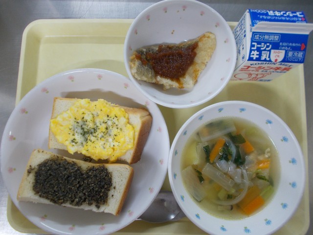 今日の主食は二種類のトーストです。『黒ごまトースト』は、黒すりごま、バーター、三温糖を混ぜたものをパンに塗って焼きました。『エッグチーズトースト』は、ゆでたまご、玉ねぎ、マヨネーズ、塩コショウを混ぜたものをパンの上にぬり、チーズとパセリをかけて焼きました。