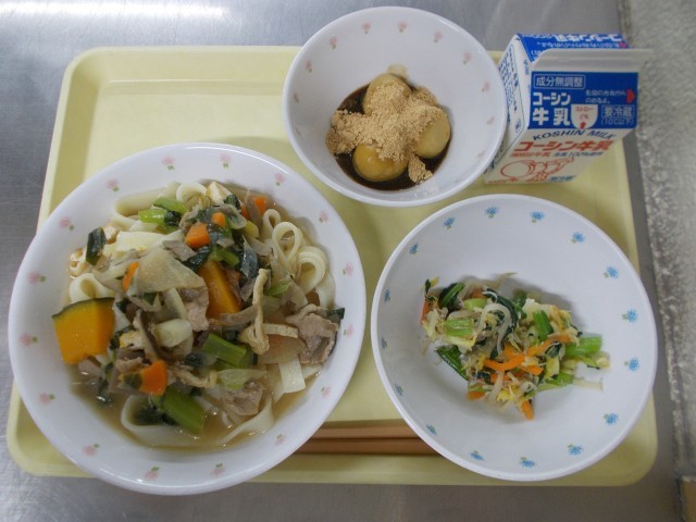 今日は冬至にちなんだ献立です。冬至には柚子湯に入る、かぼちゃを食べるなどの風習があります。昔は現代と違って、野菜を1年中食べることが難しい時代でした。そのため、ビタミンなどの多くの栄養を含み、保存がきくかぼちゃを野菜の不足する冬の時期に食べることで厳しい冬を元気に乗り切ろうとしたそうです。