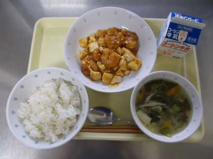 【牛乳 麦ごはん えびと豆腐のチリ炒め チンゲンサイとしめじのスープ】