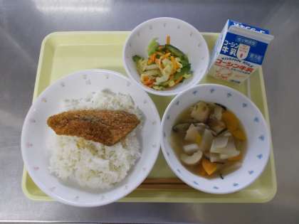 【牛乳 ぶりカツ丼 野菜のレモン醤油和え のっぺい汁】