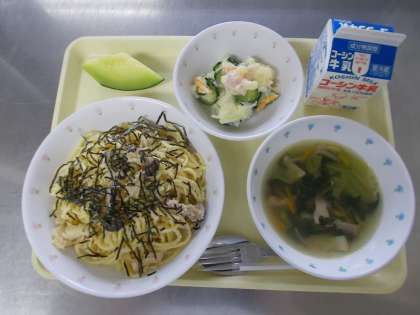 【牛乳 たらこスパゲティ ポテトサラダ コンソメスープ メロン】