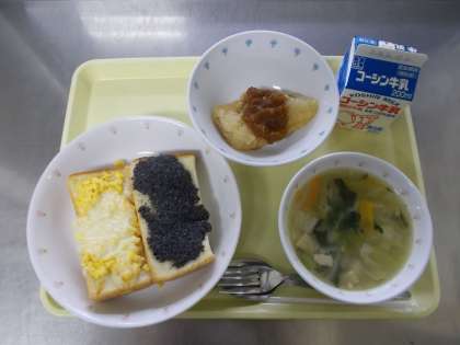 【牛乳 エッグマヨトースト 黒ごまトースト 魚のBBQソースがけ 玉ねぎときゃべつのスープ】