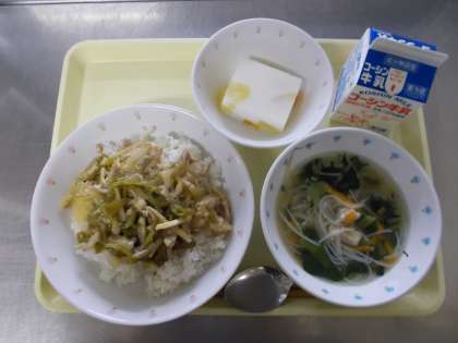 【牛乳 チンジャオロース丼 ビーフンスープ 杏仁ゼリー】