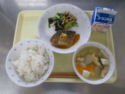 【牛乳 麦ごはん さばのみそ煮 磯和え 冬瓜汁】