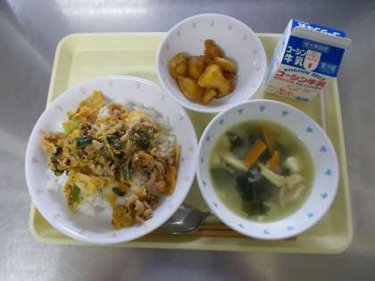 【牛乳 豚キムチ丼 韓国風スープ じゃがいものバター醤油煮】