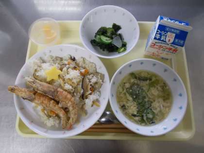 【牛乳 七夕ちらし寿司 クルマエビの素揚げ きゅうりとわかめの酢の物 七夕汁 七夕ゼリー】
