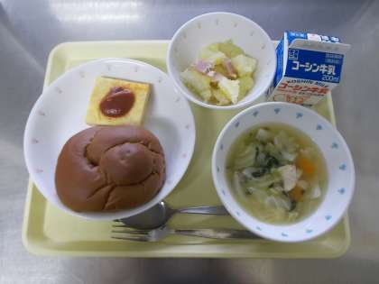 【ココアパン シーフードオムレツ ジャーマンポテト 玉ねぎときゃべつのスープ】