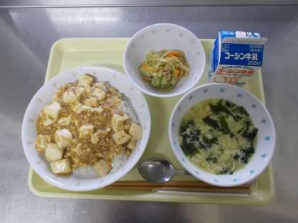 【牛乳 麻婆豆腐丼 春雨サラダ 卵とわかめの中華スープ】