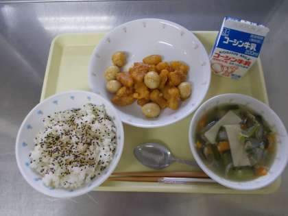 【牛乳 ごまご飯 いかと卵のチリソース煮 ワンタンスープ】