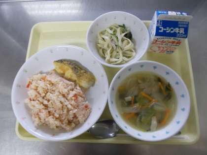 【牛乳 トマトリゾット 魚のムニエル ヌイユソテー コンソメスープ】