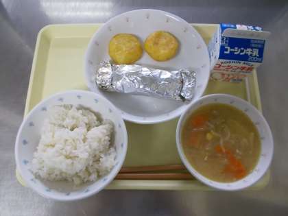 今日の給食では「みそ、砂糖、しょうゆ、みりん」で作ったたれを使用し、野菜と鮭をアルミホイルで包んで蒸し焼きにしました。みそだれと魚の旨味、野菜の甘みが合わさったこの時期におすすめの料理です。