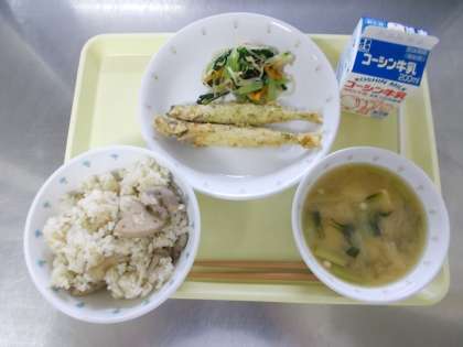 【牛乳 れんこんご飯 ししゃもの磯辺揚げ からし和え 豆腐とえのきのみそ汁】