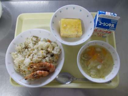【牛乳 鶏ときのこのピラフ チーズオムレツ ガーリックシュリンプ あさりときゃべつのスープ】