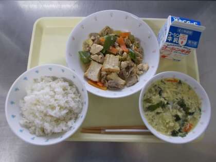 【牛乳 麦ごはん 厚揚げの肉みそ炒め かきたまわかめ中華スープ】