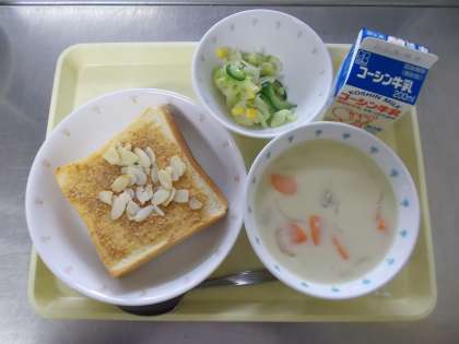 【牛乳 アーモンドトースト さつまいものシチュー コーンサラダ】
