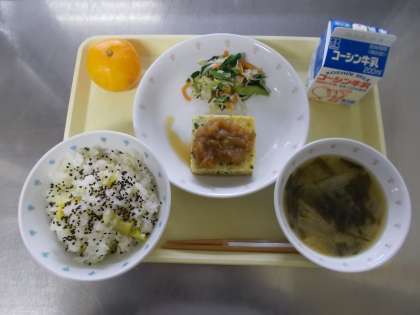 【牛乳 さつまいもご飯 卵焼き しらす和え 大根とわかめのみそ汁 温州みかん】