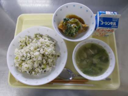 【牛乳 野沢菜チャーハン 白身魚の甘酢和え 茎わかめの中華スープ】