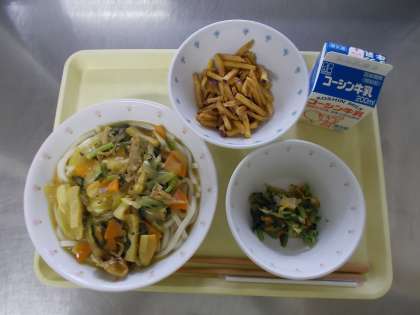 【牛乳 カレーうどん おかか和え 芋けんぴ】