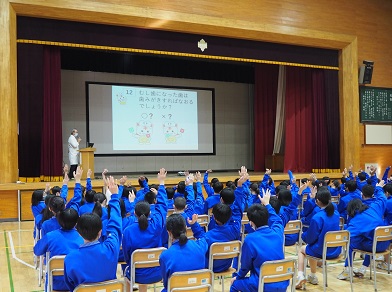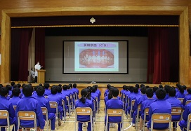 11月25日(木)、1年生を対象に歯科講話を実施しました。本校の学校医の萩原先生と、河原歯科クリニックの河原先生を講師としてお招きし、歯の大切さについてお話ししていただきました。後半はクイズ形式となり、生徒たちも頭を使いながら楽しく参加していました。
