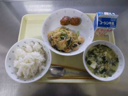 【牛乳 麦ごはん 肉団子の黒酢あんがらめ えびと春雨のピリ辛炒め 中華卵スープ】