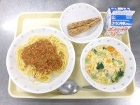 ”担々麺”のスープは、ガラスープをとり「練りごま、豆乳、しょうゆ、みそ、砂糖、ラー油」などを加えて作っています。辛さが特徴の担々麺ですが、給食では辛いのが苦手な生徒でも食べやすいよう、スープは辛味を抑えてクリーミーにし、上にのせるひき肉の味付けを辛めして、混ぜて食べるとバランスが良くなるように仕上げました。また、ひき肉には、意識して摂らないと不足じがちな食材「大豆」も刻んで混ぜています。