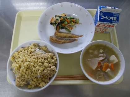 【牛乳 高野豆腐入りそぼろご飯 にぎすのから揚げ 磯和え 豚汁】