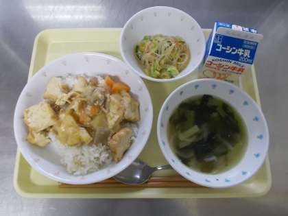 【牛乳 家常豆腐丼 春雨サラダ わかめスープ】