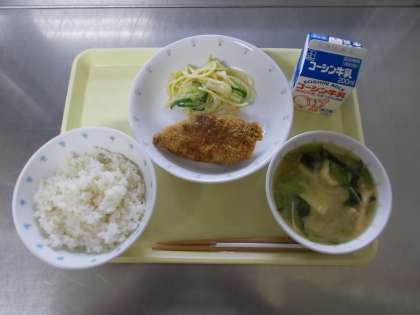 【牛乳 麦ごはん ほっけフライ スパゲティサラダ じゃがいものみそ汁】