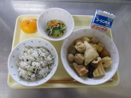 【牛乳 わかめご飯 おでん からし和え 温州みかん】
