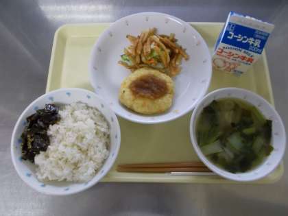 【牛乳 麦ごはん 昆布の佃煮 和風ハンバーグおろしソースがけ 揚げ芋サラダ 大根のみそ汁】