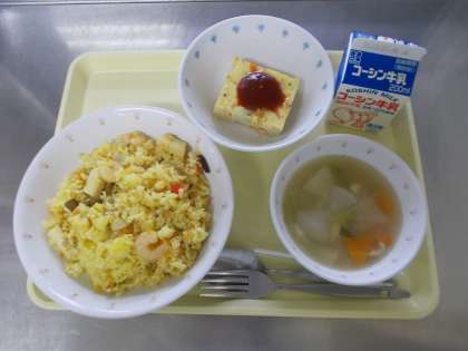 ”パエリア”は、本来は米と具を一つのフライパンで一緒に炊き上げて作りますが、給食ではご飯と具を別々に作り、最後に混ぜて作っています。ご飯はターメリックを入れて炊き、具は「鶏肉、いか、えび、あさり、にんじん、玉ねぎ、トマト」を炒めて塩、こしょうで調味しました。ご飯を少し硬めに炊き、具の水分も一緒に混ぜることで、ご飯に食材のうま味がしみ込み、深みのある仕上がりになります。