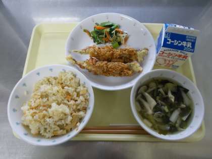 【牛乳 こぎつねご飯 ししゃものおかき揚げ しょうが和え 白菜としめじのすまし汁】