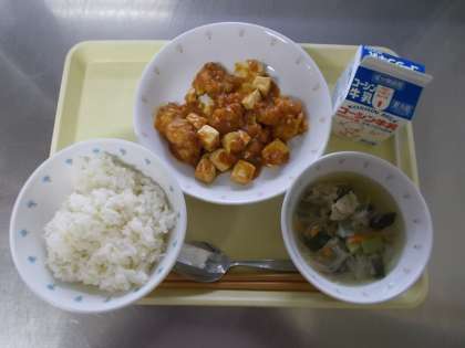 【牛乳 麦ごはん えびと豆腐のチリ炒め 切り干し大根の中華風スープ】