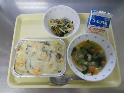 【牛乳 えびドリア 海藻サラダ 玉ねぎときゃべつのスープ】
