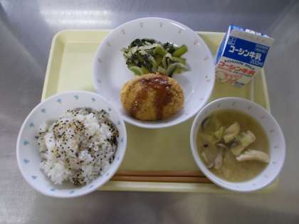 【牛乳 ごま塩ご飯 卵入りコロッケ 小松菜ソテー きゃべつと油揚げのみそ汁】