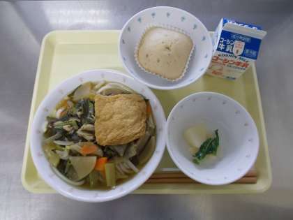 【牛乳 きつねうどん かぶの香り漬け 小豆入り蒸しパン】