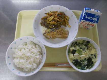 【牛乳 麦ごはん 白糸だらの煮つけ じゃがいもの金平 かきたま汁】