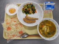 また、スープは、給食で食べたいという声があった”えびワンタンスープ”を作りました。えびワンタンは「えびのすり身、しょうが」と調味料を混ぜた餡をワンタンの皮で包んで作っています。野菜とワンタンがたっぷり入ったボリューム満点のスープです。