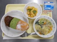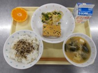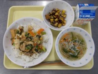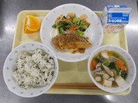 今日の主菜は揚げ出し豆腐です。豆腐を水切りし、粉をつけて油で揚げ、大根おろしで作ったたれをかけました。揚げ出し豆腐に合わせ、しょうがのきいたしょうが和えを副菜にしたので、口内調味をして食べられるように献立を工夫しました。