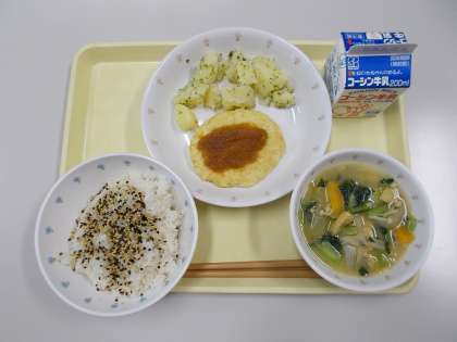 付け合わせは粉ふき芋にしたので、お味噌汁に小松菜をたっぷり入れてバランスをとっています。