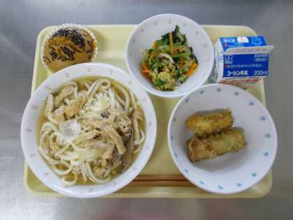 今日は暑い日にぴったりの冷やしきつねうどんでした。つゆは関西風のだしをしっかりきかせた薄い色のつゆにしました。厚削りや昆布、干し椎茸のうまみがたっぷりです。油揚げは大きい形ではなく、短冊切りにしてつゆの中に入れました。細かくなっていることで、麺と絡んで一緒に食べやすく工夫しています。